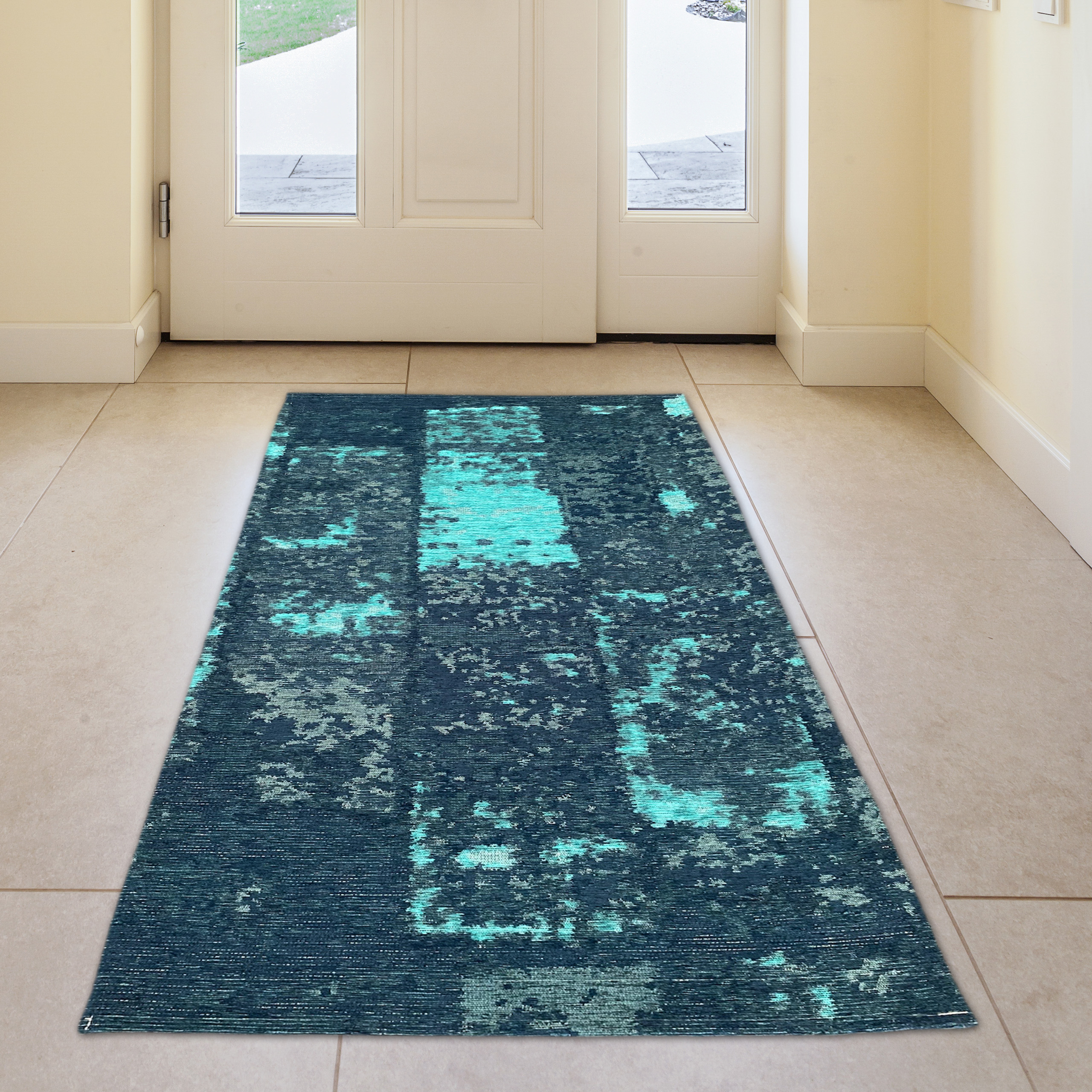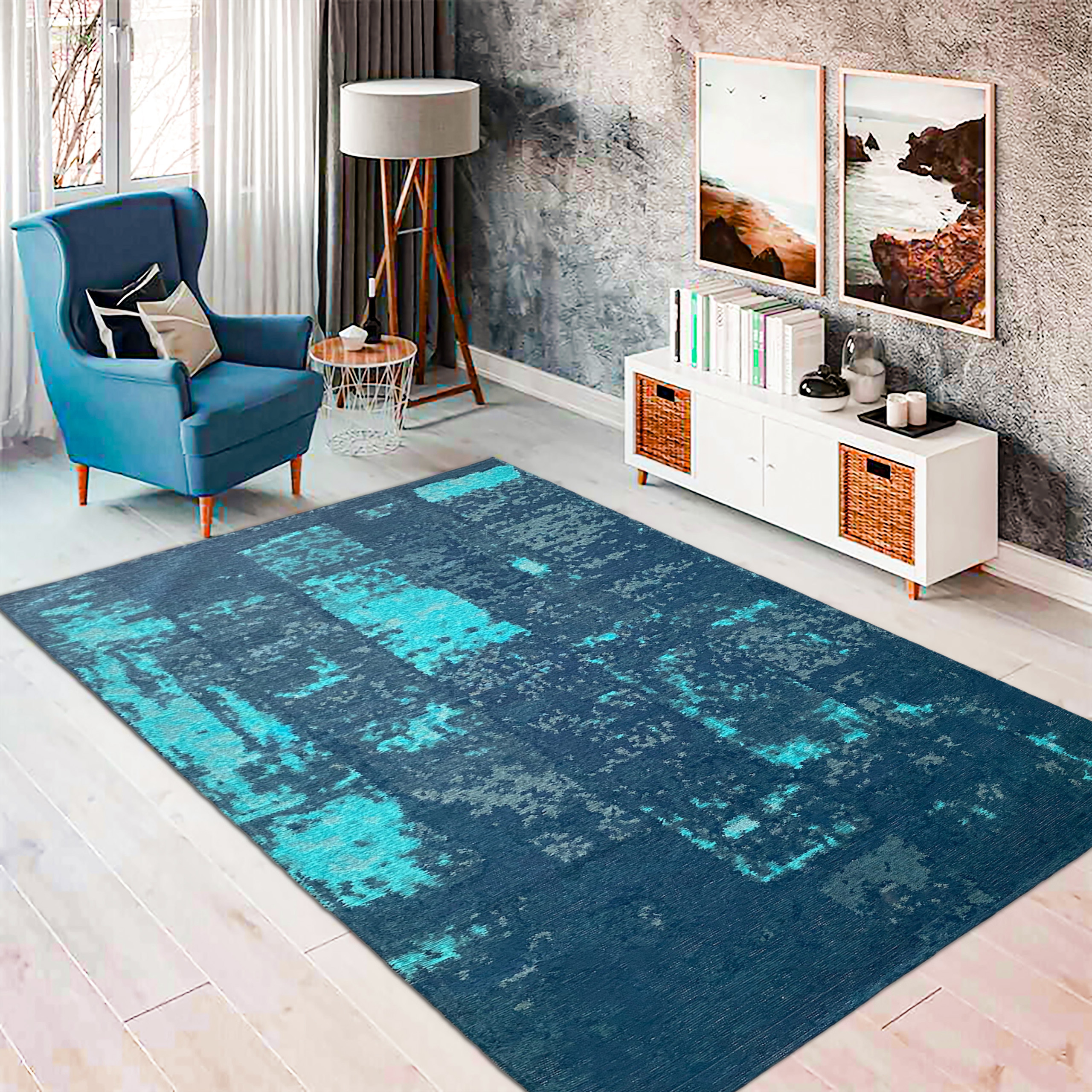 Der abstrakte Teppich mit einem Muster in Blau, Weiß und Grau ist ein Kunstwerk für jeden Raum. Die Farbkombination verleiht eine kühle und beruhigende Wirkung. Das abstrakte Design erzeugt eine tiefe visuelle Wirkung und fügt Eleganz hinzu. Der Teppich ist aus hochwertigen Materialien gefertigt, langlebig und funktional. Eine atemberaubende Ergänzung für jeden Raum.