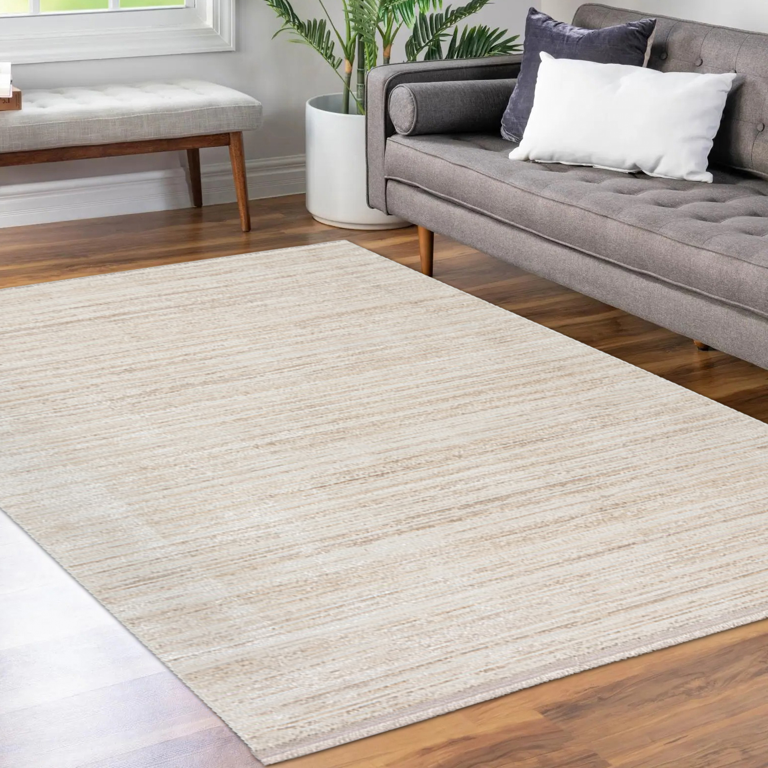 Dieser Orientteppich besticht durch sein subtil gestreiftes Muster, das ein ansprechendes Wohnambiente schafft. Sein leichtes und filigranes Design macht ihn besonders für den Sommer ideal, da er mit seinen hellen Farben jedem Raum eine frische Eleganz verleiht. Doch auch in den anderen Jahreszeiten sorgt dieses Modell für eine warme Atmosphäre, besonders in Räumen mit dunklen Möbeln. Je nach Lichteinfall präsentiert sich der "Wollteppich" in verschiedenen Nuancen, die ihm sogar einen leichten Glanz verleihen können. Er ergänzt hervorragend Büros, Schlaf- oder Wohnzimmer sowie Eingangsbereiche und wird Gäste in einer Studenten-WG mit seinem angenehmen Design positiv überraschen.