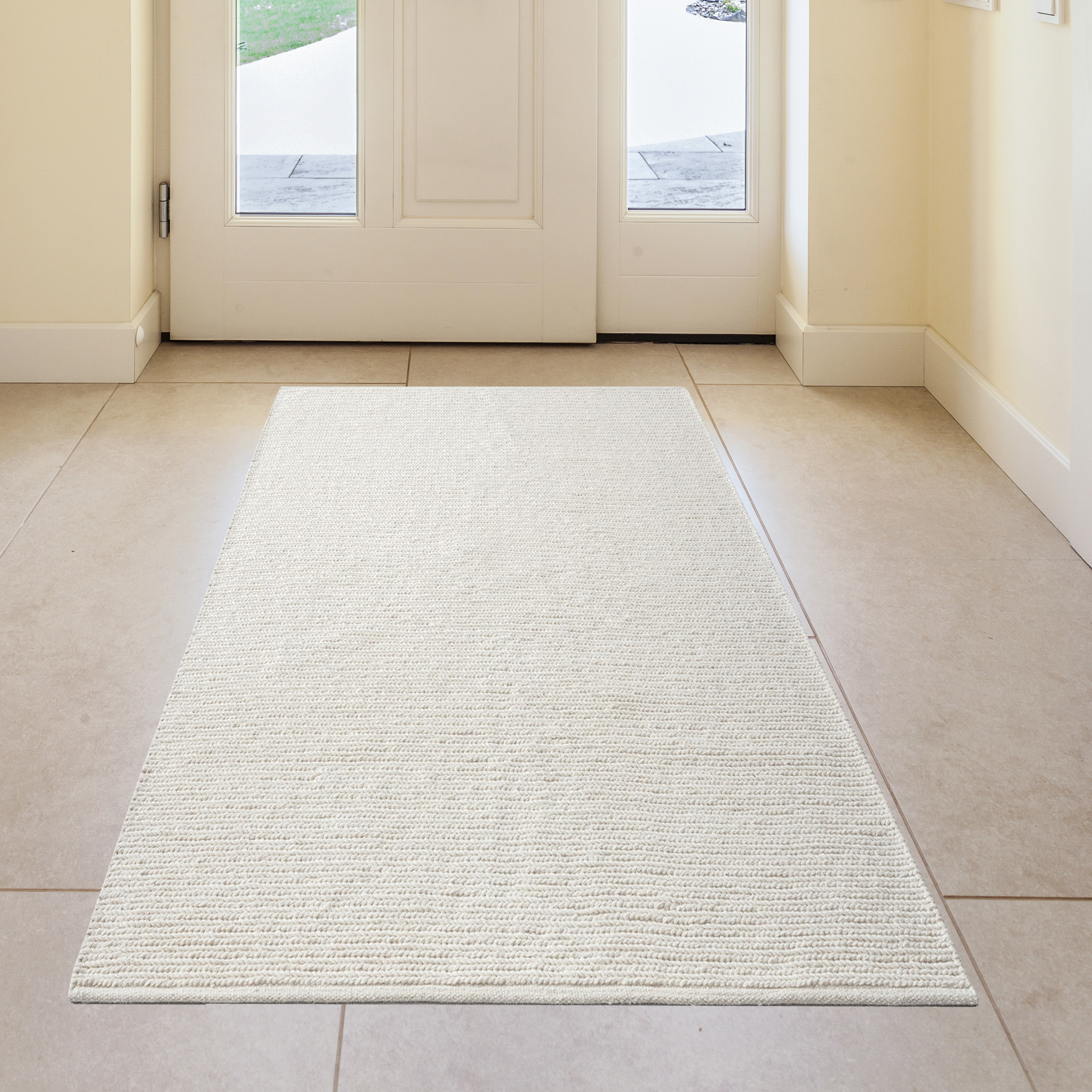 Erleben Sie die zeitlose Eleganz unseres handgewebten Teppichs in Creme. Hergestellt aus einer sorgfältig ausgewählten Mischung von Wolle und Baumwolle, bietet er nicht nur einen strapazierfähigen Bodenbelag, sondern auch vielseitige Nutzungsmöglichkeiten. Das ansprechende Uni-Design fügt sich nahtlos in jeden Raum ein und verleiht Ihrem Zuhause einen Hauch von Raffinesse.